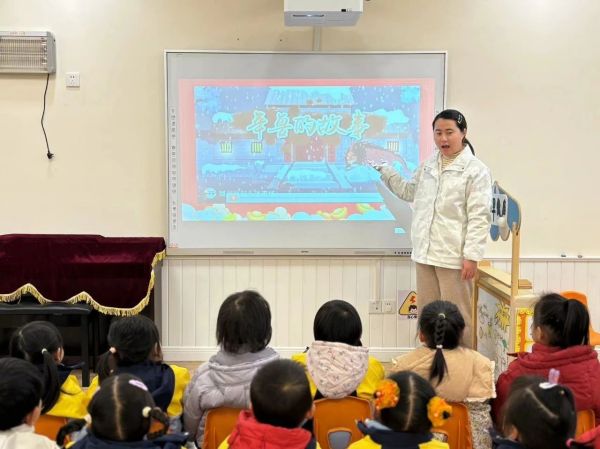 大紅燈籠高高掛,喜氣洋洋過新年?!澳辍背錆M著的神話色彩,什么是“年”?為什么要過年?幼兒一起專心致志地聽繪本《年獸的故事》,了解年的由來。