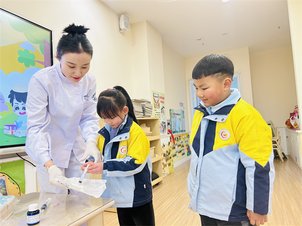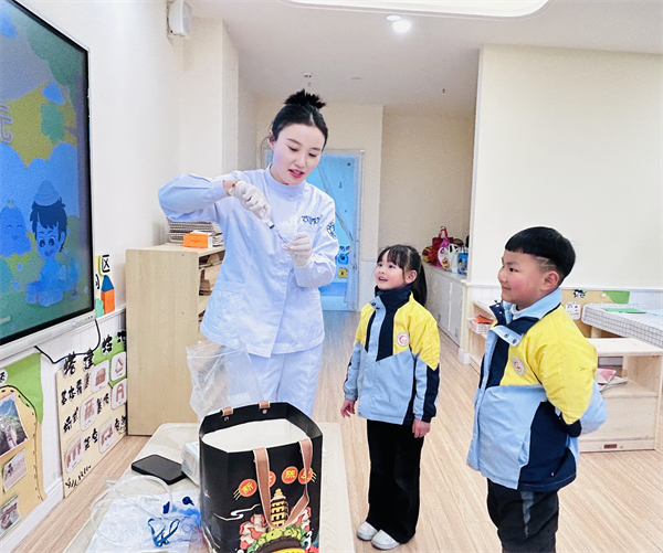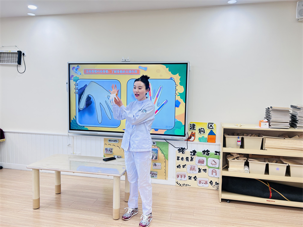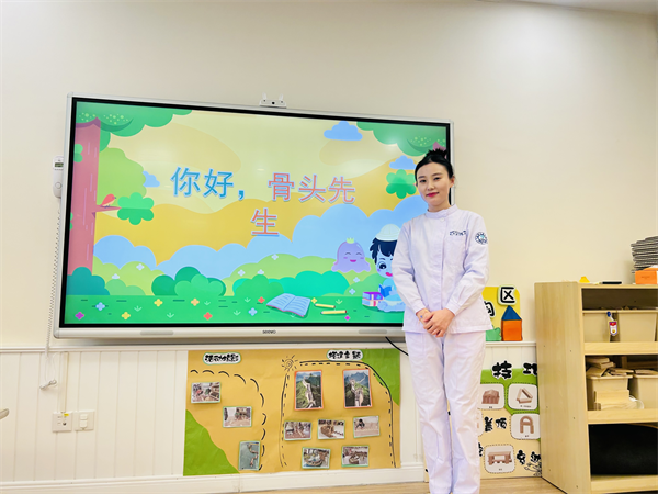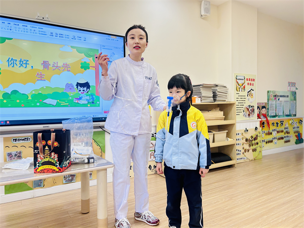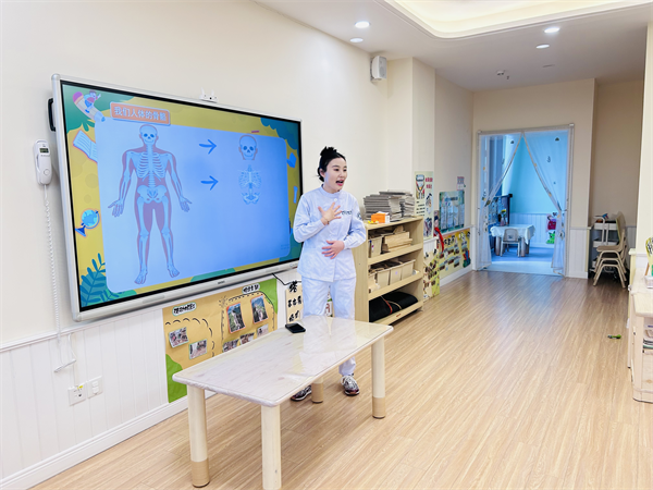 徐藝文媽媽從“人體里為什么會(huì)長(zhǎng)骨頭”為切入點(diǎn),并向孩子們展示常用的醫(yī)療用品,通過(guò)生動(dòng)有趣的視頻引導(dǎo)孩子們了解人體中的骨骼組成以及骨骼與身體各部位之間的關(guān)系。以情境化、游戲化的教育方式引導(dǎo)孩子及時(shí)關(guān)注自身的身體健康。
