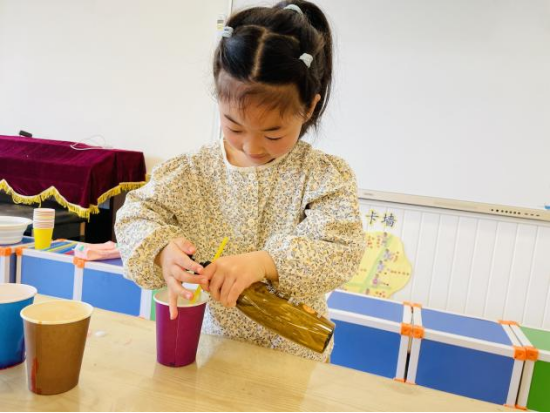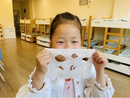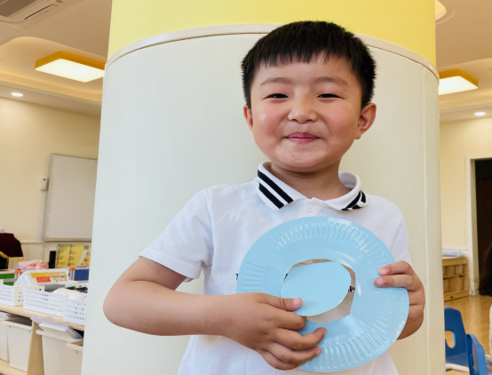 陽陽:“把紙盤的中間剪一個(gè)洞,有洞就可以吹出長長的泡泡。”