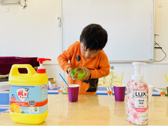 幼兒還選擇了其他物品制作泡泡液,肥皂、洗手液,并用記錄了下來。