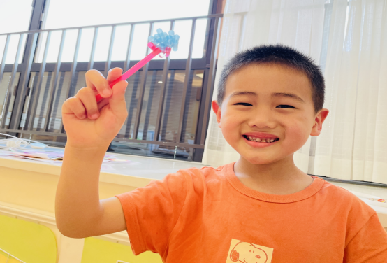 程程:“把聰明棒拼一拼就可以吹出泡泡?!?/p>