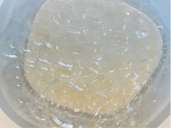 水、洗潔精、白糖,攪拌,直至容器里面出現(xiàn)密密麻麻的泡泡。