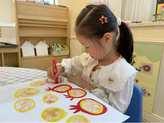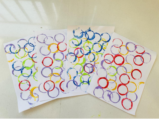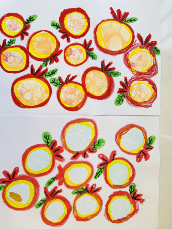 泡沫易碎,轉(zhuǎn)瞬即逝。每個(gè)泡泡像是七彩的夢(mèng),幼兒想把這美麗的泡泡留住。幼兒利用瓶蓋和拓印工具,在紙上拓印出了一個(gè)個(gè)五顏六色的泡泡。