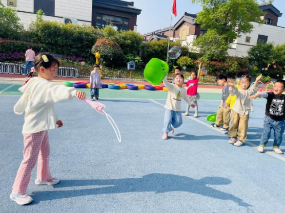 在游戲中,幼兒跟著吹出來的“泡泡”時(shí)而升高,時(shí)而降低,看著時(shí)而變大,時(shí)而變小,或一不小心就吹破了,寶貝們都隨之追逐奔跑、跳高低身,時(shí)時(shí)刻刻都興奮著!