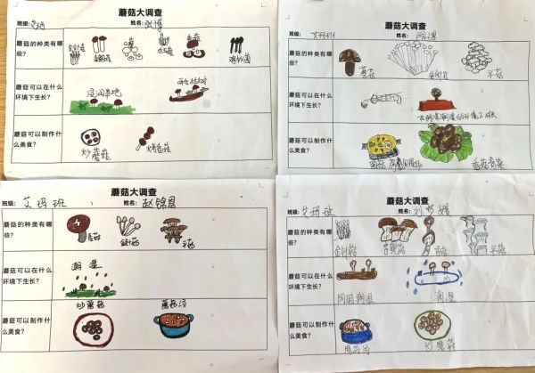 鑒于孩子對(duì)蘑菇的了解尚顯零散,我們引導(dǎo)孩子和父母、老師一同參與,制作了精美的調(diào)查表,共同查閱資料,探訪菜市場(chǎng),尋找蘑菇的奧秘。