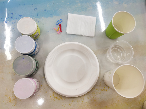 實驗材料:洗潔精、清水、紙杯、盤子、橡皮筋、顏料、濕紙巾。