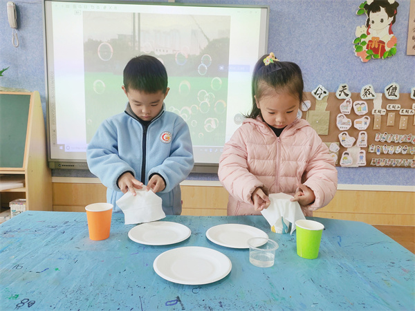 了解認識了實驗的步驟和材料,幼兒在老師的幫助下,準備開始實驗啦!濕紙巾和洗潔精碰在一起會發(fā)生什么呢?讓我們一起來看一看吧。