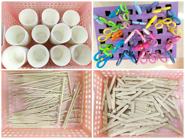 針對此問題我們首先聽取孩子們的想法,讓小朋友們把知道的編織材料找出來,然后一起尋找適合編織的工具。