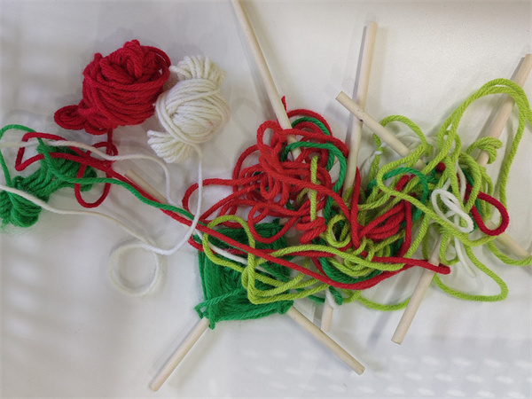 在曼達(dá)拉編織的基礎(chǔ)上小朋友們有了經(jīng)驗,現(xiàn)在將原有的兩根木棍增添至了三根木棍或者四根,將木棍頭拼接在一起形成了三角骨架后,再進(jìn)行編織。小朋友們認(rèn)真、有條理的編織手中的物品,編織的顏色也從單一的毛線,換成多種毛線,編織出了一條條獨特的小魚。