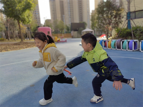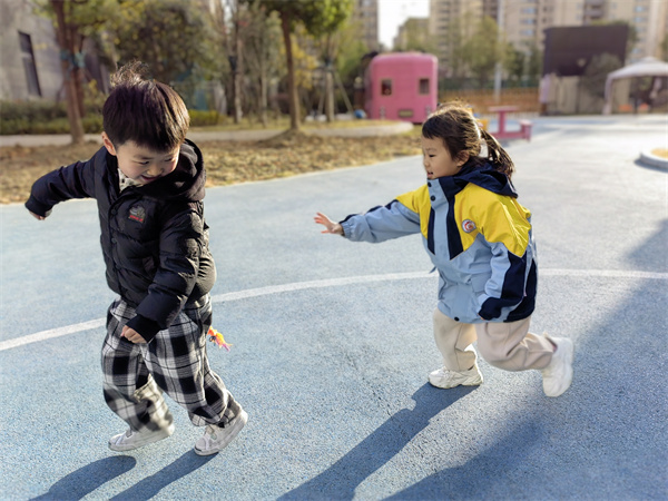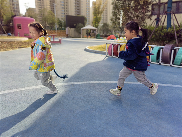 瞧,小朋友將自己編的麻花辮投入戶外活動,玩起了抓尾巴的游戲。