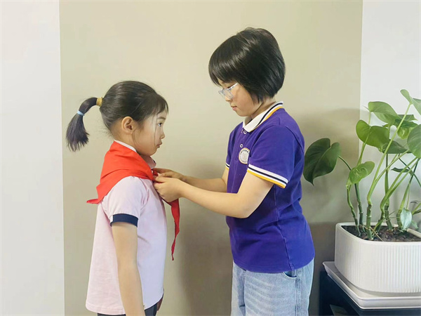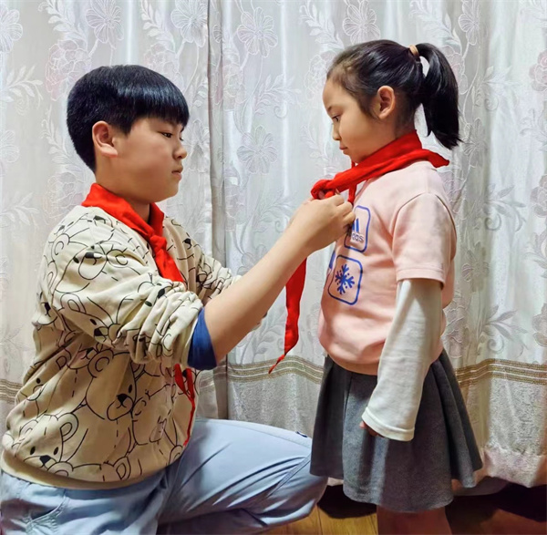 為了幫助小朋友對(duì)紅領(lǐng)巾有了更深的了解,家里的哥哥姐姐幫助自己的弟弟妹妹佩戴紅領(lǐng)巾,并告訴他們少先隊(duì)員應(yīng)該愛(ài)護(hù)紅領(lǐng)巾!