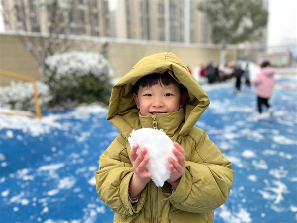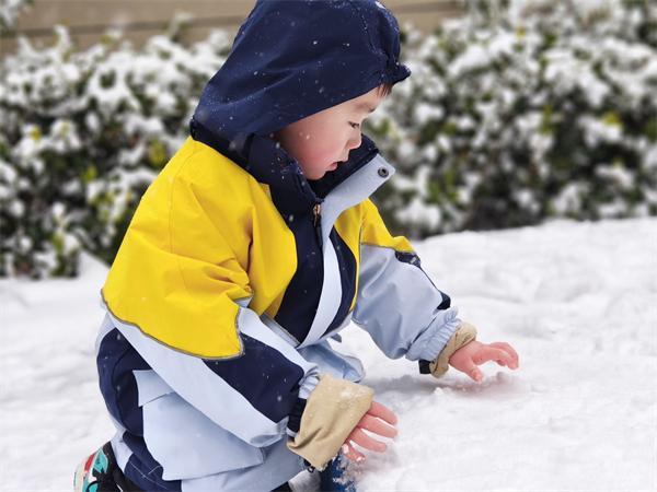 對于幼兒來說,雪就是大自然送來的驚喜,是幼兒期盼的禮物。屋檐上的雪、樹梢上的雪、操場上的雪,甚至落在滑梯上的雪,都讓幼兒的眼睛閃閃發(fā)光,充滿了好奇和喜悅。