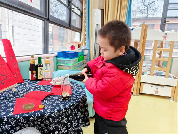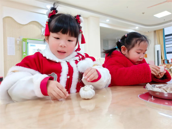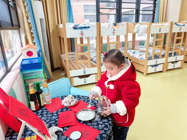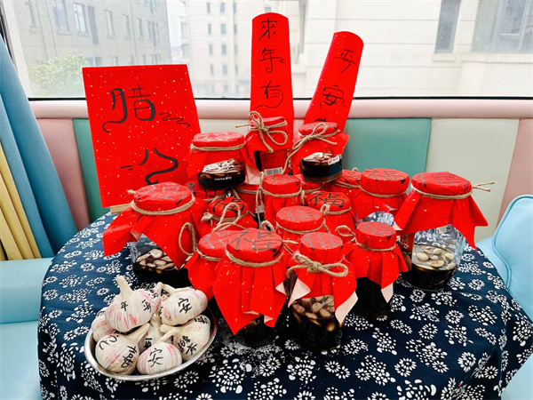 我國北方的大部分家庭還會(huì)在臘月初八這天有用醋泡蒜的習(xí)俗,叫臘八蒜。臘八蒜就是用醋來泡制大蒜瓣,其材料就是醋、大蒜瓣兒和白糖。臘八醋,要泡到大年初一,初一吃餃子,要吃素餃子,取一年素素凈凈之意,蘸臘八醋吃,別有一番滋味是。“臘八醋”不僅味道醇正,而且久放不壞。于是,小三班的小朋友們和老師一起腌制了一罐罐美味的臘八蒜!