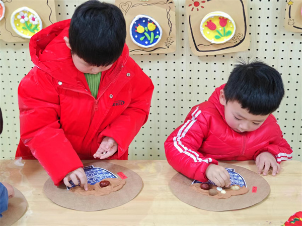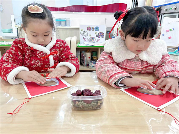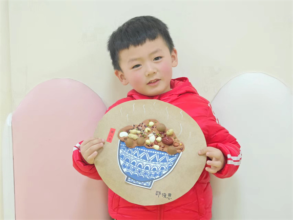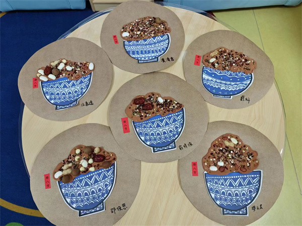 同時(shí)小朋友們也和老師動(dòng)手動(dòng)腦,利用各種豆子、卡紙和橡皮泥等材料制作了關(guān)于臘八粥的精美手工作品。