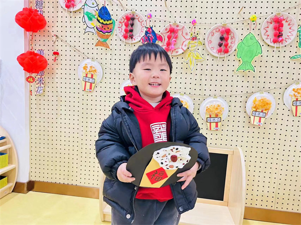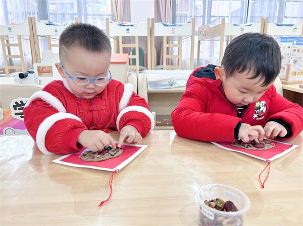 臘八粥的食材不僅提供了食物的營養(yǎng)價(jià)值,還蘊(yùn)含著豐富的文化和象征意義。比如:紅豆寓意思念,黑豆寓意富貴平安,花生寓意健康長壽,桂圓寓意團(tuán)圓等??炜?!紅豆、黑豆、花生、綠豆、桂圓等臘八粥的原料通過小一班小朋友們的創(chuàng)作變成了一幅幅精美的豆貼畫吊墜,真的好看極了!