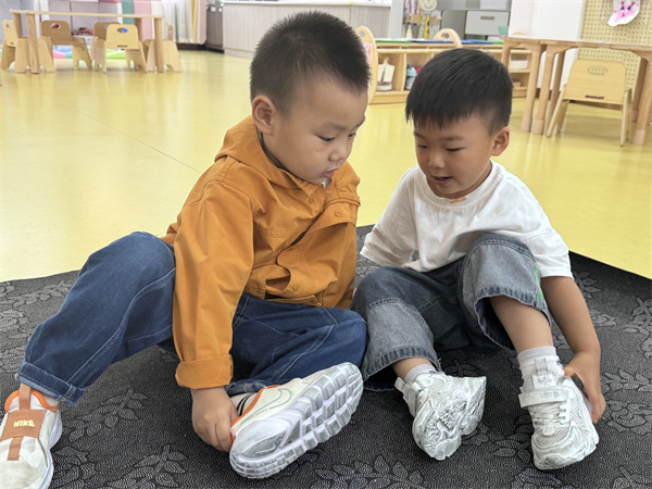 在日常生活中,總有幾個(gè)幼兒是懵懵的狀態(tài),認(rèn)不清自己的鞋子,拿著別人的鞋子往自己腳上穿。于是,我們從幼兒的實(shí)際問(wèn)題出發(fā),針對(duì)個(gè)別幼兒不認(rèn)識(shí)鞋子的情況進(jìn)行了一對(duì)一指導(dǎo)。首先帶領(lǐng)幼兒認(rèn)識(shí)自己鞋子的花紋和顏色,通過(guò)用手摸,眼睛看熟悉自己的鞋子,隨后開(kāi)展找鞋子游戲,加深幼兒對(duì)自己鞋子的印象。