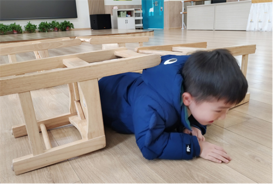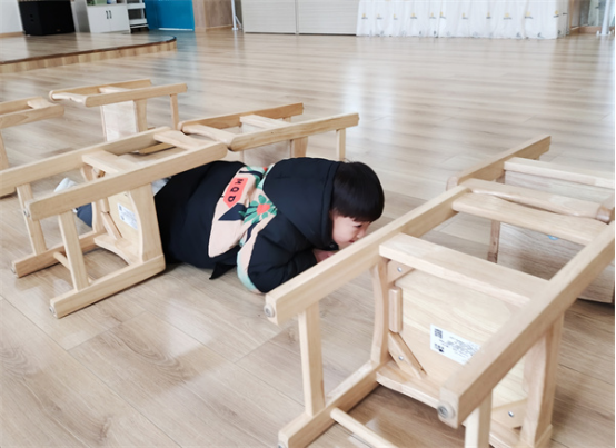 將小小的椅子組成小山洞,幼兒用自己的身體及手腳并用的方法匍匐前進(jìn),穿過椅子障礙物。個別幼兒能夠快速靈活地通過,但大部分幼兒因椅被的高度及空間原因并不能完美通過,此時教師可適當(dāng)介入,引導(dǎo)幼兒調(diào)整好身體,用正確姿勢匍匐前行。