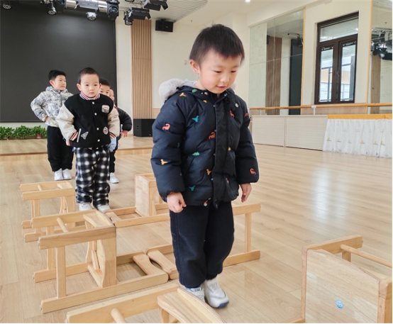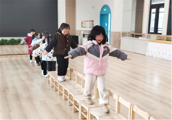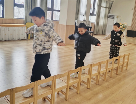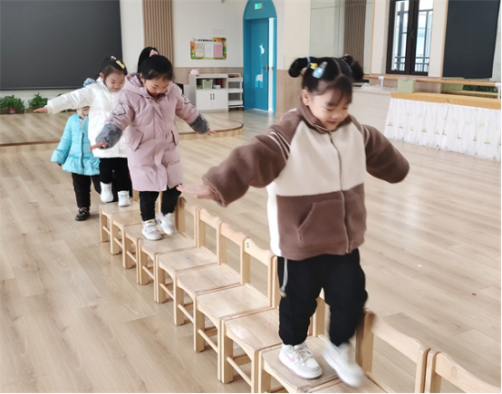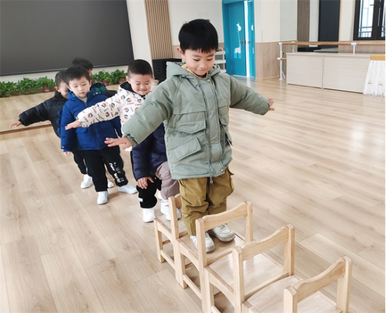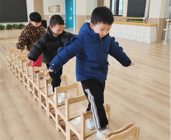 小朋友們一起將椅子連成一條直線,椅子橋擺好后,他們便開啟了一場關(guān)于椅子的奇妙之旅。過橋時把雙手打開,踩在椅子中間,站穩(wěn)之后再走,保持平衡,小朋友們要學(xué)會耐心等待,保護(hù)好自己,一步步、慢慢走。