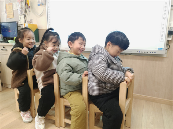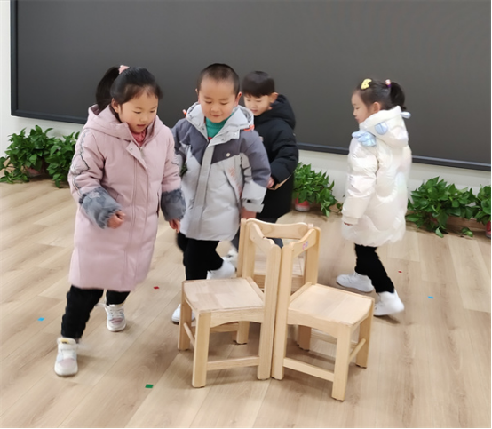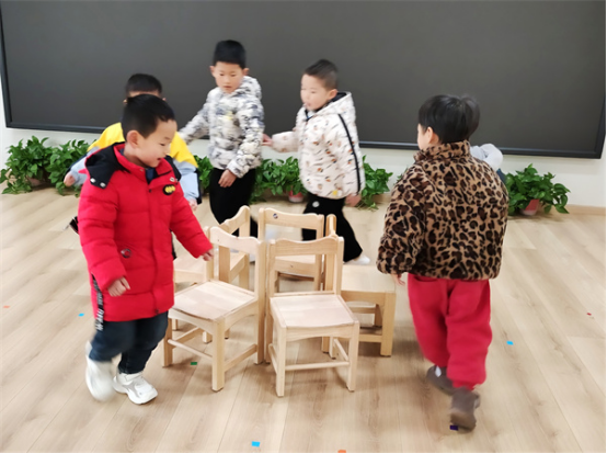 把自主權(quán)交給幼兒,鼓勵幼兒大膽探索,變化擺放椅子,自由探討、制定規(guī)則、商量玩法等。漸漸地,小椅子的不同玩法被一群聰明可愛的小朋友“挖掘”出來了。