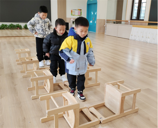 在發(fā)展幼兒平衡能力的基礎(chǔ)上,增加相對的難度,大部分幼兒依舊能夠輕松通過,不過速度相比“獨木橋”來說慢了很多。個別幼兒在游戲過程中不小心踩到地上也并沒有因此氣餒,反而是立馬調(diào)整繼續(xù)游戲。