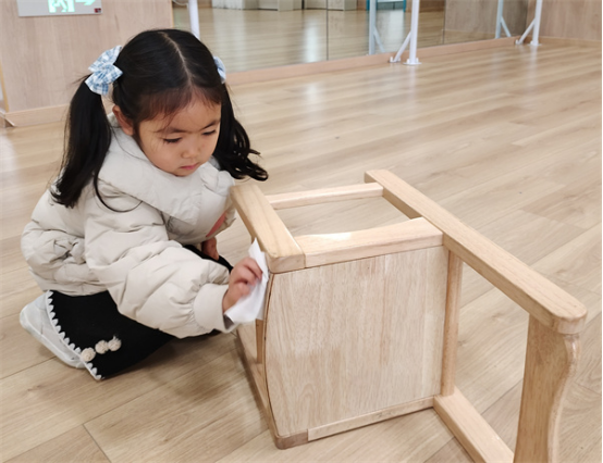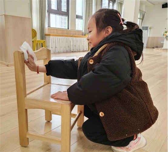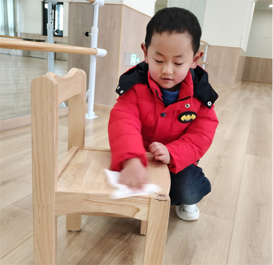 椅子游戲結(jié)束后,小朋友們一起分工合作整理椅子,洛伊突然喊起來:“哎呀!這把椅子上黑黑的!”“肯定是玩游戲的時候踩臟的,椅子臟了怎么辦?”小朋友們開始討論起來。過一會,小朋友們紛紛跑去保育老師那里找來濕紙巾,開始了自己的護(hù)椅行動,只聽小朋友們嘴里叨咕著:我給椅子“擦肚子”、我來給椅子“洗洗腳”、椅子的“小臉”也要洗一洗。
