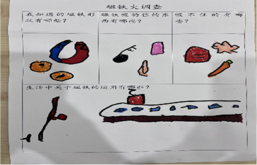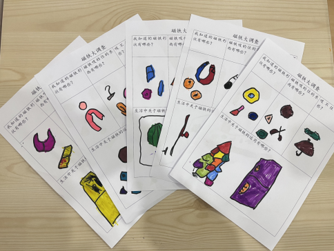 生活中有哪些東西是可以被吸住,哪些是不可以被吸住的呢?為了更好地總結(jié)經(jīng)驗(yàn),我們制作了一份《磁鐵大調(diào)查》,讓孩子和家長(zhǎng)一起用圖文結(jié)合的形式將結(jié)果記錄下來(lái)。