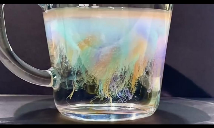 4.染色的牛奶用滴灌滴入帶有鹽水的透明杯中。