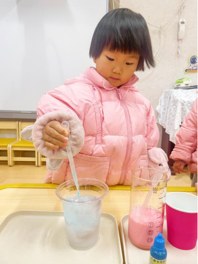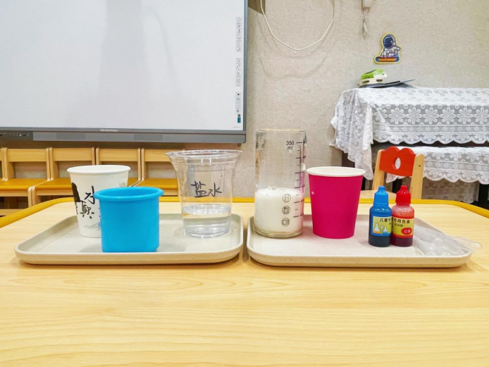 清水、鹽水、色素、牛奶、滴管、透 明杯子