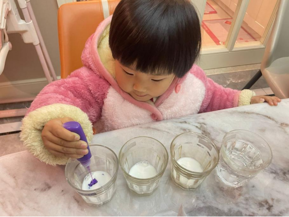3.牛奶中加入自己喜歡的色素攪拌均勻。