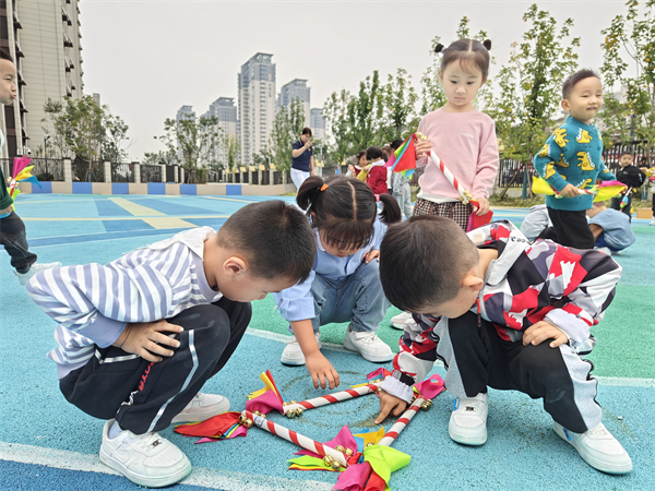 本次活動是以五彩花棒的多樣玩法為主,讓每一個孩子在自主探索中享受游戲與運動帶來的樂趣,活動中,教師進行適當(dāng)?shù)囊龑?dǎo)與示范,鼓勵每一位幼兒發(fā)揮自己的想象力,在玩中學(xué),在學(xué)中玩。