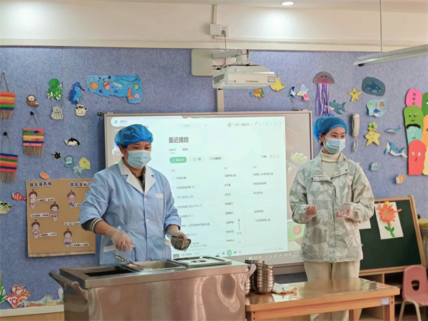 陪餐人員進(jìn)入班級后,首先檢查餐具衛(wèi)生是否合格,當(dāng)班老師配餐過程中穿戴是否符合要求。
