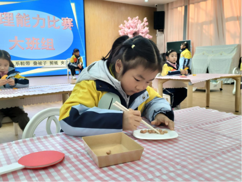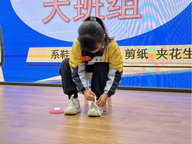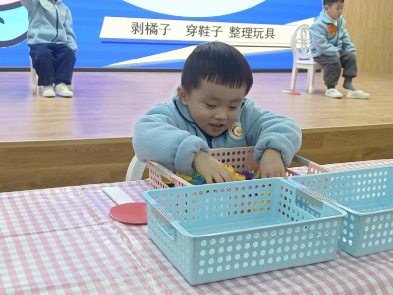 活動(dòng)開始前,年級教師展開教研會,討論根據(jù)孩子的年齡特點(diǎn)及可行性,制定了初步比賽項(xiàng)目,最終確定小班組比賽項(xiàng)目為:剝橘子、穿鞋子、整理玩具。中班組比賽項(xiàng)目為:穿外套、疊褲子、剝雞蛋、串珠子。大班組比賽項(xiàng)目為:系鞋帶、疊被子、剪紙、夾花生。