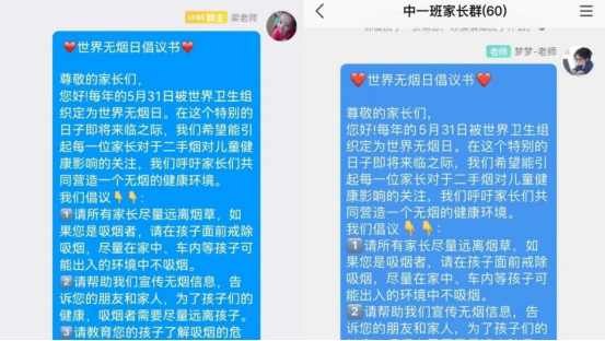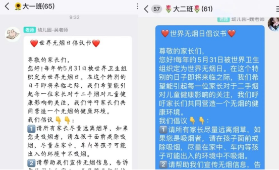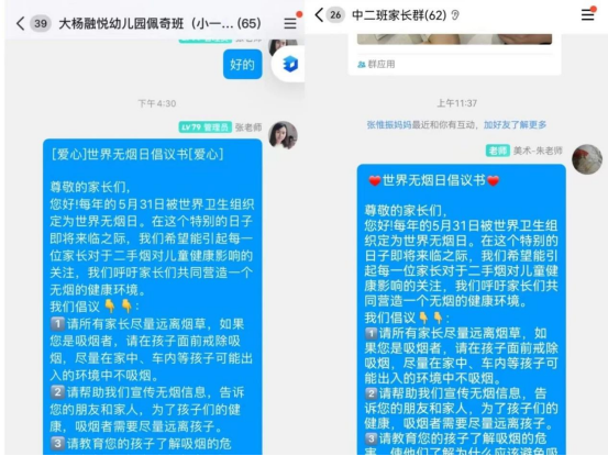 幼兒園不僅通過豐富多彩的主題活動倡導禁煙,還積極組織各班教師與家長在班級群中進行深入的交流互動。教師們用溫暖而堅定的文字,在群內傳播禁煙的理念,并熱切地呼吁家長們共同為孩子們營造一個無煙的家園環(huán)境,讓健康成為孩子們最堅實的成長保障。