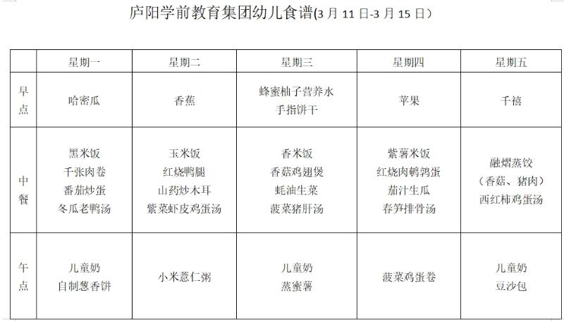 廬陽學前教育集團2024年3月11日-3月15日幼兒食譜