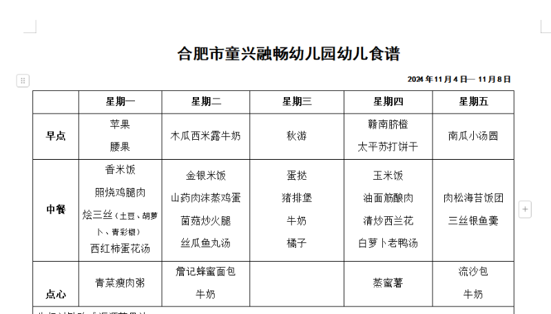 廬陽(yáng)教育發(fā)展集團(tuán)2024年11月4日-11月8日幼兒食譜