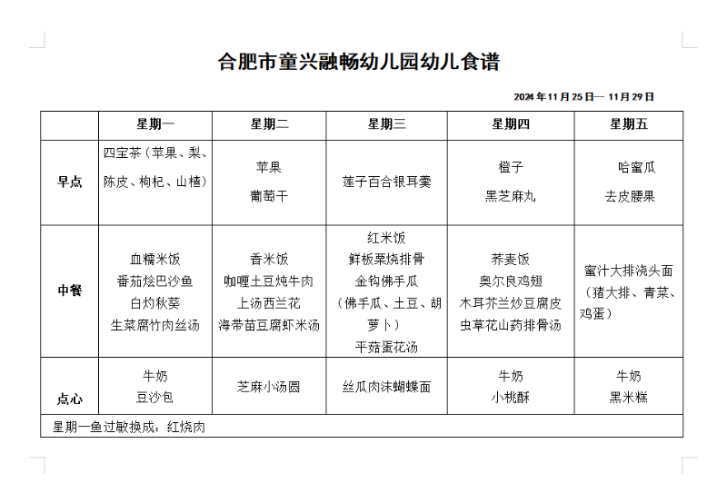 廬陽教育發(fā)展集團2024年11月25日-11月29日幼兒食譜