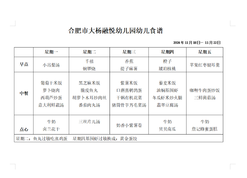 廬陽教育發(fā)展集團(tuán)2024年11月18日-11月22日幼兒食譜