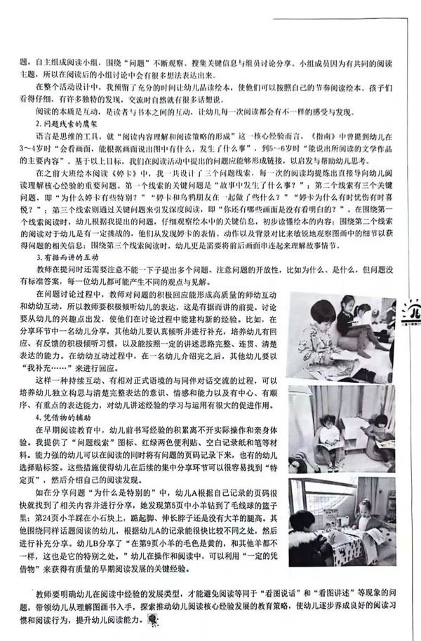 繪本以其獨特的圖文結(jié)合特點和意義表現(xiàn)形式,引導幼兒多感官認識世界,學習語言知識,使其在趣味十足的閱讀中發(fā)展語言能力。立足幼兒實際,合理選擇與幼兒的認知水平等相適宜的優(yōu)質(zhì)繪本,創(chuàng)設(shè)溫馨和諧有利于幼兒閱讀的語言環(huán)境,圍繞繪本內(nèi)容有意識地創(chuàng)新閱讀方式、提問方式,師幼互動方式,從而促進幼兒的語言核心經(jīng)驗的發(fā)展。