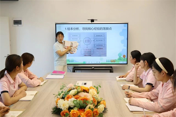 幼兒階段是學習語言、發(fā)展語言能力的關(guān)鍵階段。繪本中帶有大量色彩豐富、生動形象的圖片,且故事內(nèi)容往往具有較高的趣味性,對幼兒具有較大的吸引力?;谟變旱恼Z言學習特點,我們以繪本為載體,多方面促進幼兒語言核心經(jīng)驗的發(fā)展。在業(yè)務(wù)負責董欣顥的帶領(lǐng)下,全體教師共學《兒童與健康》--《繪本閱讀中落實幼兒語言核心經(jīng)驗的策略》一文。學習在繪本活動時,提升幼兒在的口語、書面語、文學語言等理解與表達能力。