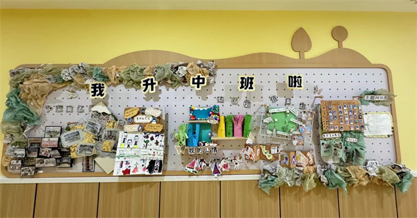 中班幼兒好奇好問,喜歡思考探究、動手操作。中班組教師提供多元的游戲材料支持幼兒探索世界,在與環(huán)境的互動之中獲得成長。每一處裝飾都是孩子喜歡的物品,每一件作品都是孩子的大作,用孩子的話、孩子的作品裝扮出了會說話的墻面。