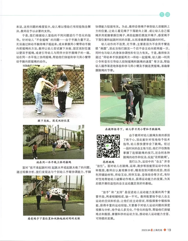 在《3-6歲兒童學(xué)習(xí)與發(fā)展指南》中健康領(lǐng)域動作發(fā)展目標要求幼兒要“具有一定的平衡能力,動作協(xié)調(diào)、靈敏”。針對這一目標《綱要》明確指出5-6歲幼兒要“能連續(xù)跳繩”。