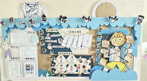 本次主題墻為同一主題的不同層次,各班級是以幼兒主題活動為主的發(fā)聲墻,教師們繪聲繪色的描述讓人眼前一亮。各年級組都采用不同方式來呈現(xiàn)“我的身體”這一主題。托小班通過認識身體的外部構(gòu)造來認識自己,了解身體各個部位的作用。中班組通過認識身體的內(nèi)部構(gòu)造來探索身體更多的奧秘。在設計主題墻時老師們秉著以幼兒為中心的原則,從幼兒的角度出發(fā),進行主題墻的創(chuàng)設。