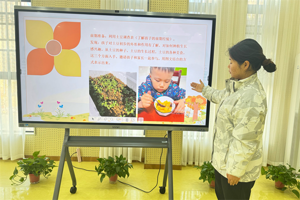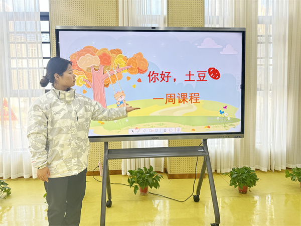 小二班教師劉慧分享的是課程是《你好,土豆》課程起源是在植物區(qū)觀察水培的植物時,幼兒對土豆的很感興趣。“我昨天就吃了土豆絲”“薯條就是用土豆做的”,幼兒經(jīng)過了一番議論,一場土豆的奇妙之旅展開了。根據(jù)幼兒對土豆好奇心,從認識土豆開展了五大領域的活動,并根據(jù)幼兒的興趣不同展開了區(qū)域游戲活動。
