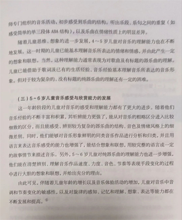 這一年齡階段的兒童對音樂的感受和理解能力都有了更大的進步。隨著音樂經(jīng)驗的不斷豐富和積累,其聽辨能力更強了,能從對音樂的粗略區(qū)分進入比較細致的區(qū)分,而且能感受、辨別較為復雜的器樂曲的結構、音色及情緒風格上的細微差別。同時,能夠對音樂形象鮮明的同類音樂作品進行分析和歸類,并且用語言來表達音樂感受的能力也增強了,能結合想象和聯(lián)想,用較完整的語言或一定的故事情節(jié)來描述音樂。另外,對純器樂曲的理解能力也進一步增強能在清楚辨別、理解音樂作品速度、力度、音色、節(jié)奏等表現(xiàn)手段變化的過程中進行大膽的想象和聯(lián)想,并給出充分的理由。