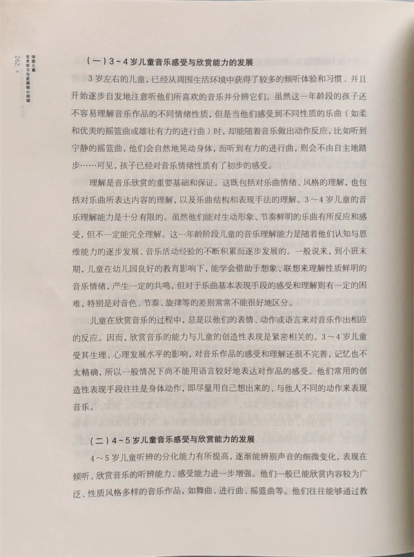4~5 歲兒童聽辨的分化能力有所提高,逐漸能辨別聲音的細微變化,表現(xiàn)在傾聽、欣賞音樂的聽辨能力、感受能力進一步增強,一般已能欣賞內(nèi)容較為廠泛、性質風格多樣的音樂作品,如舞曲、進行曲、搖籃曲等。往往能夠通過教師專門組織的音樂活動,初步感受到樂曲的結構。聽出樂段、樂句之間的重復,以及樂曲在情緒性質上的明顯差異,這一時期的兒童已能基本理解音樂所表達的情緒和情感,并由此產(chǎn)生一定的想象和聯(lián)想。