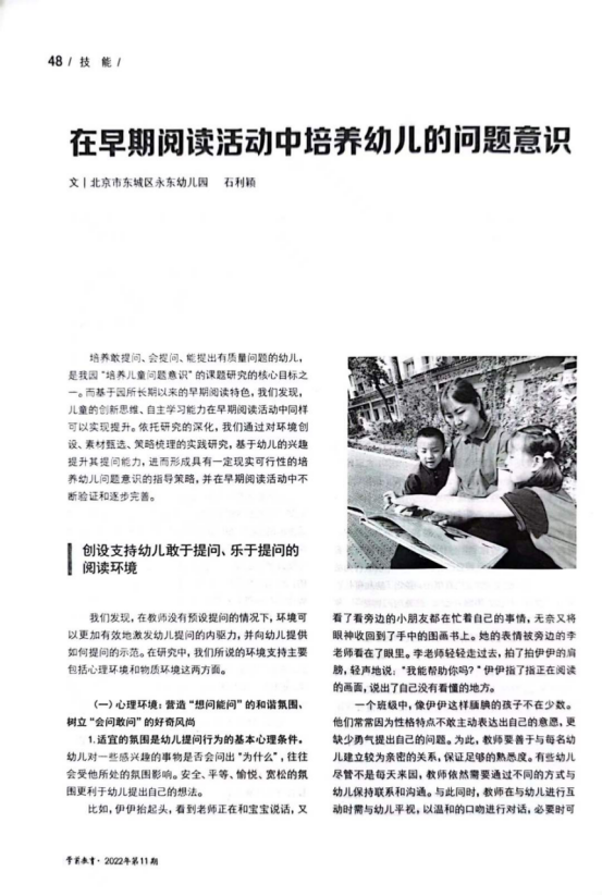 基于幼兒興趣,在早起閱讀中為提升幼兒問題能力,在業(yè)務(wù)負(fù)責(zé)董欣顥的帶領(lǐng)下,全體教師共學(xué)了期刊《學(xué)前教育》--《在早期閱讀活動中培養(yǎng)幼兒的問題意識》一文,進行幼兒“悅+閱讀”培養(yǎng)幼兒問題意識路徑的探究。
