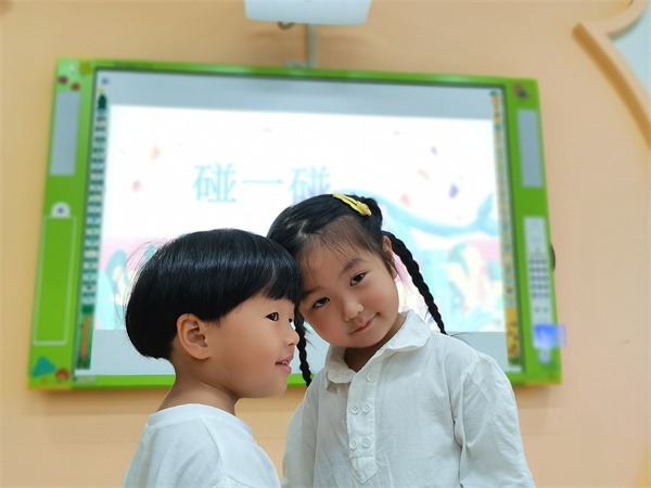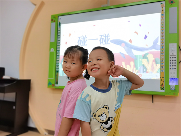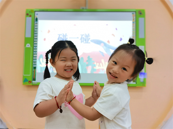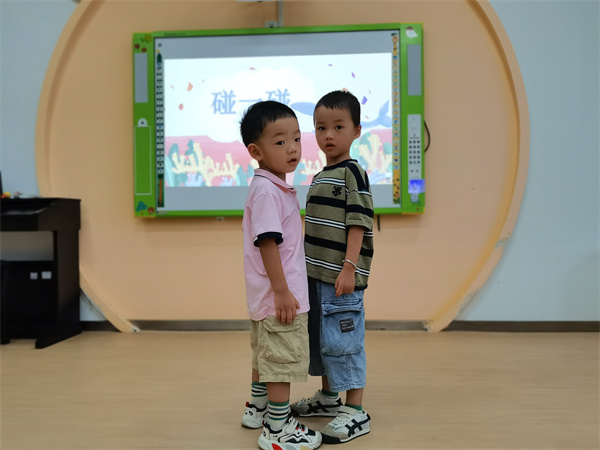“找一個朋友碰一碰……”通過音樂游戲《碰一碰》孩子們用身體的部位與朋友碰一碰,拉近了彼此的距離,初步建立了親密的同伴情感。