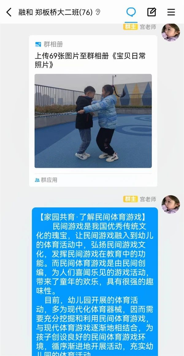 活動前期,幼兒回家與爸爸媽媽一起重溫童年的生活,回憶小時候玩過的民間游戲,共同了解民間體育游戲,熟悉了游戲的名稱與玩法。