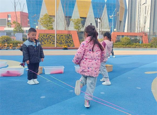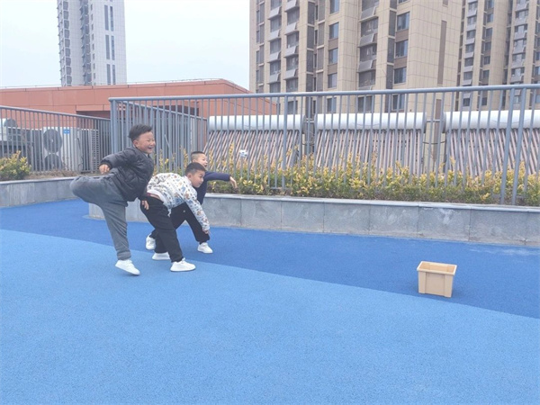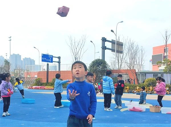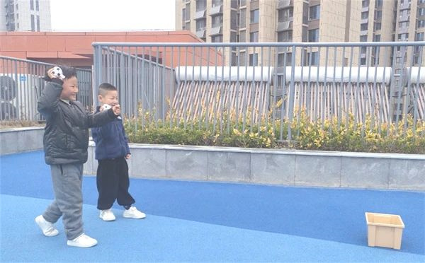 “哼!大灰狼,看招!”小朋友們側(cè)身站立,將沙包舉過頭頂,然后用力扔出,投向大灰狼的家,解救小紅帽。在投擲過程中,小朋友們逐漸意識到,不僅需要手臂力量,還要有良好的空間感判斷能力。整個過程中,孩子們相互鼓勵,歡聲笑語回蕩在操場上。