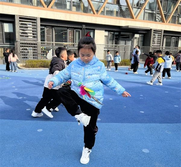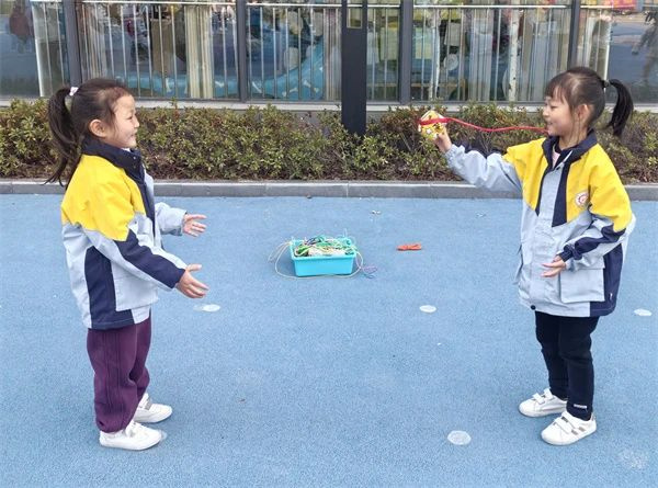在歡快的音樂聲中,游戲開始了。瞧!孩子們自主挑選喜歡的器材,隨后三個一堆、五個一群,有的當(dāng)起小老師來,有的快樂地玩耍著。孩子們分享交流,體驗民間游戲的樂趣,收獲友誼。讓我們一起來看看孩子們游戲時的精彩瞬間吧!